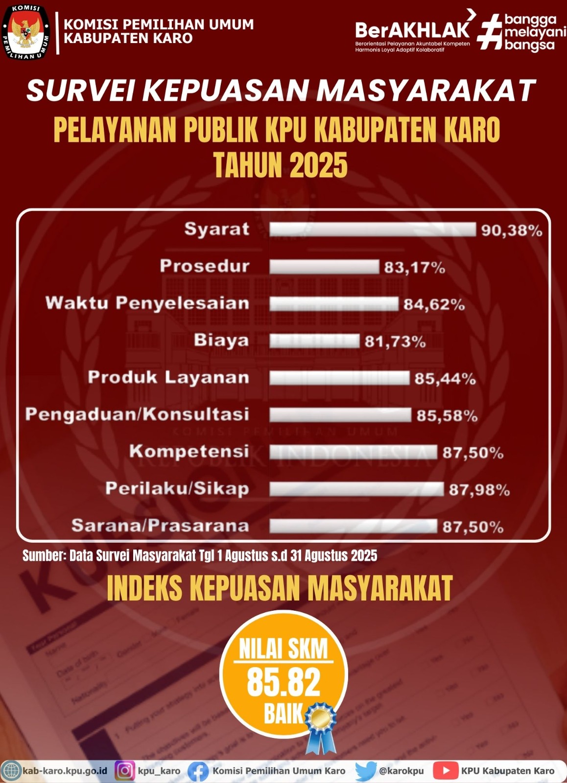 SURVEI KEPUASAN MASYARAKAT PELAYANAN PUBLIK KPU KABUPATEN KARO TAHUN 2025 Selasa, 09 September 2025 09:52 33 Bagikan: Telah dilihat 33 kali