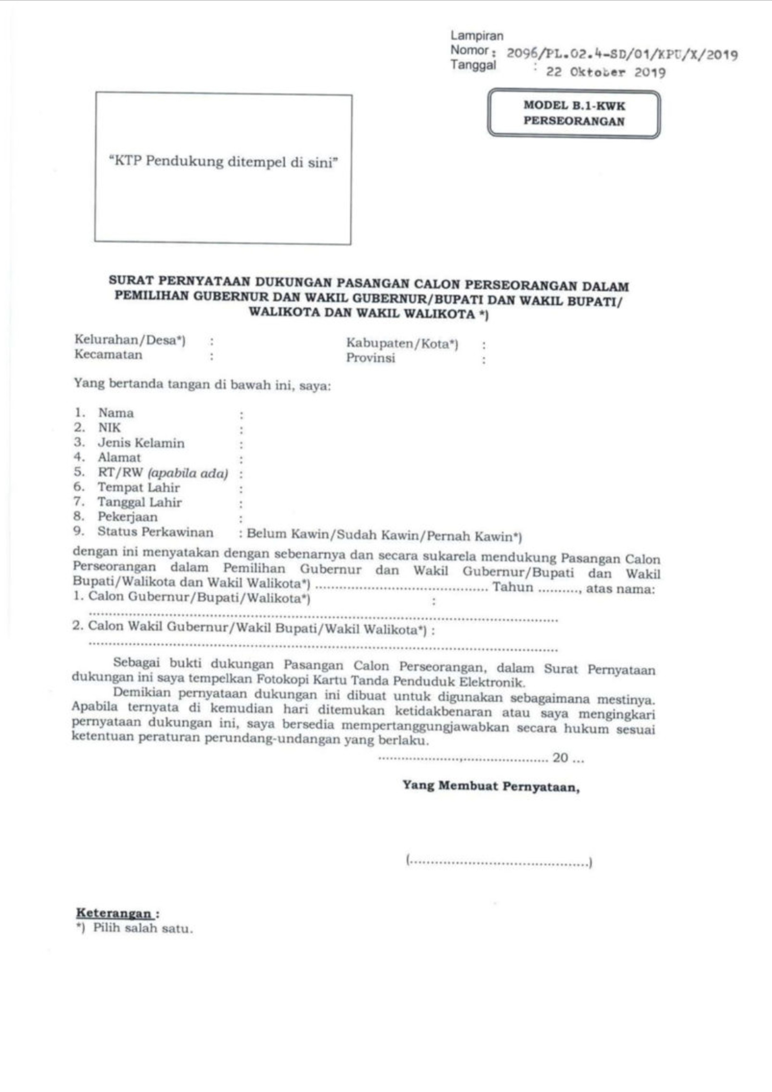 Form Model “B.1.-KWK Perseorangan” Yang Harus Dikumpulkan Bakal Calon Bupati dan Wakil Bupati Kabupaten Karo Pada Pilkada Tahun 2020