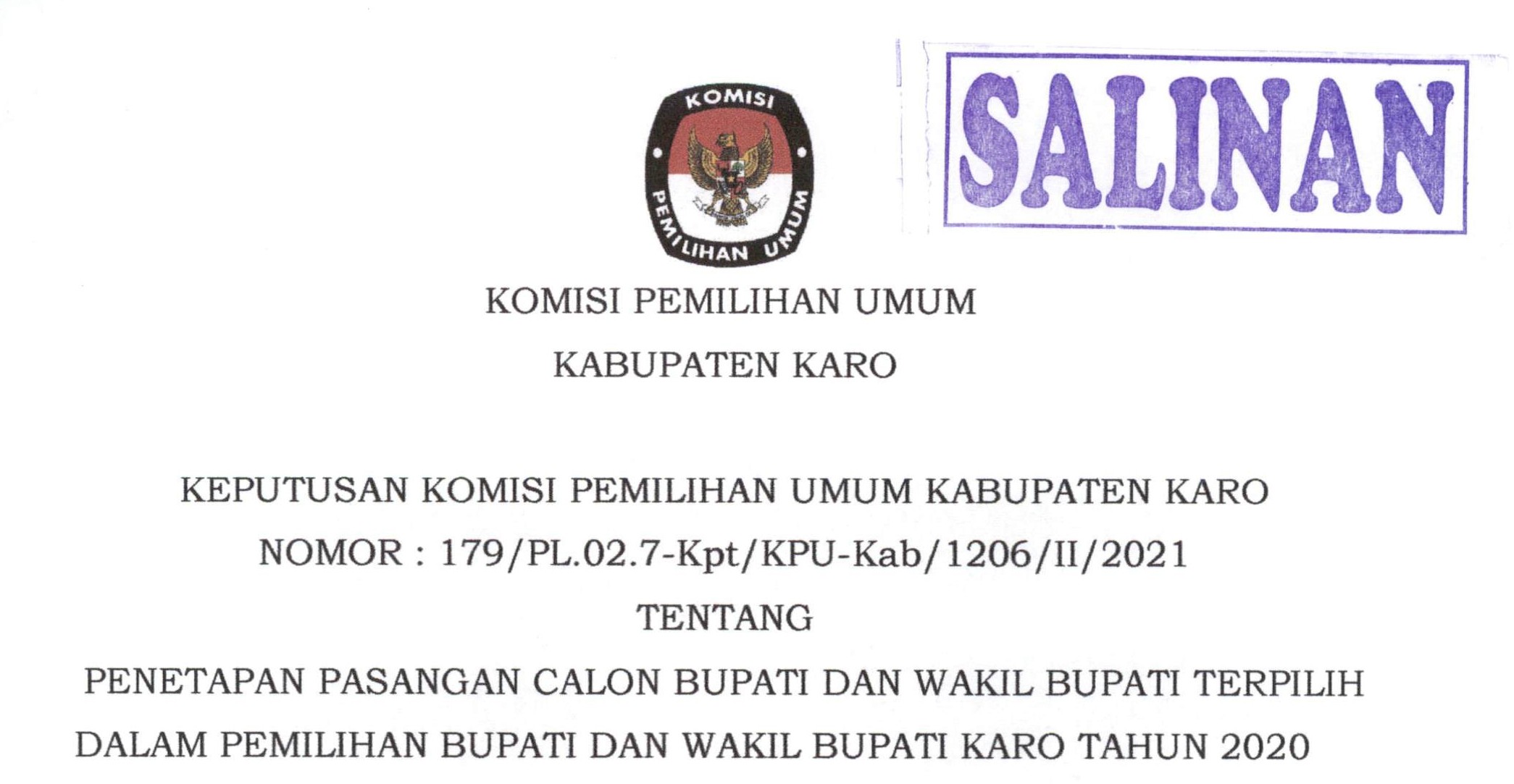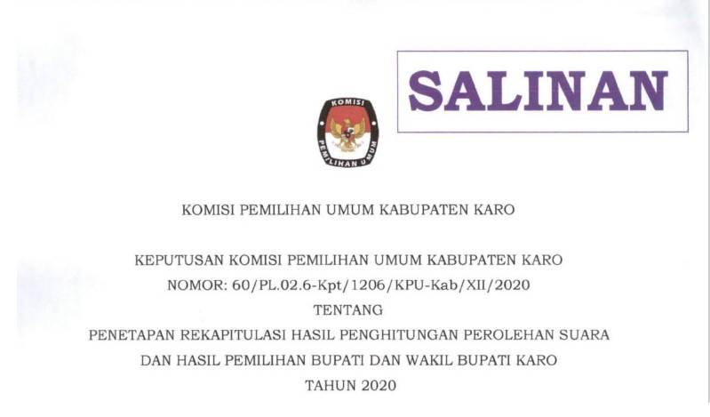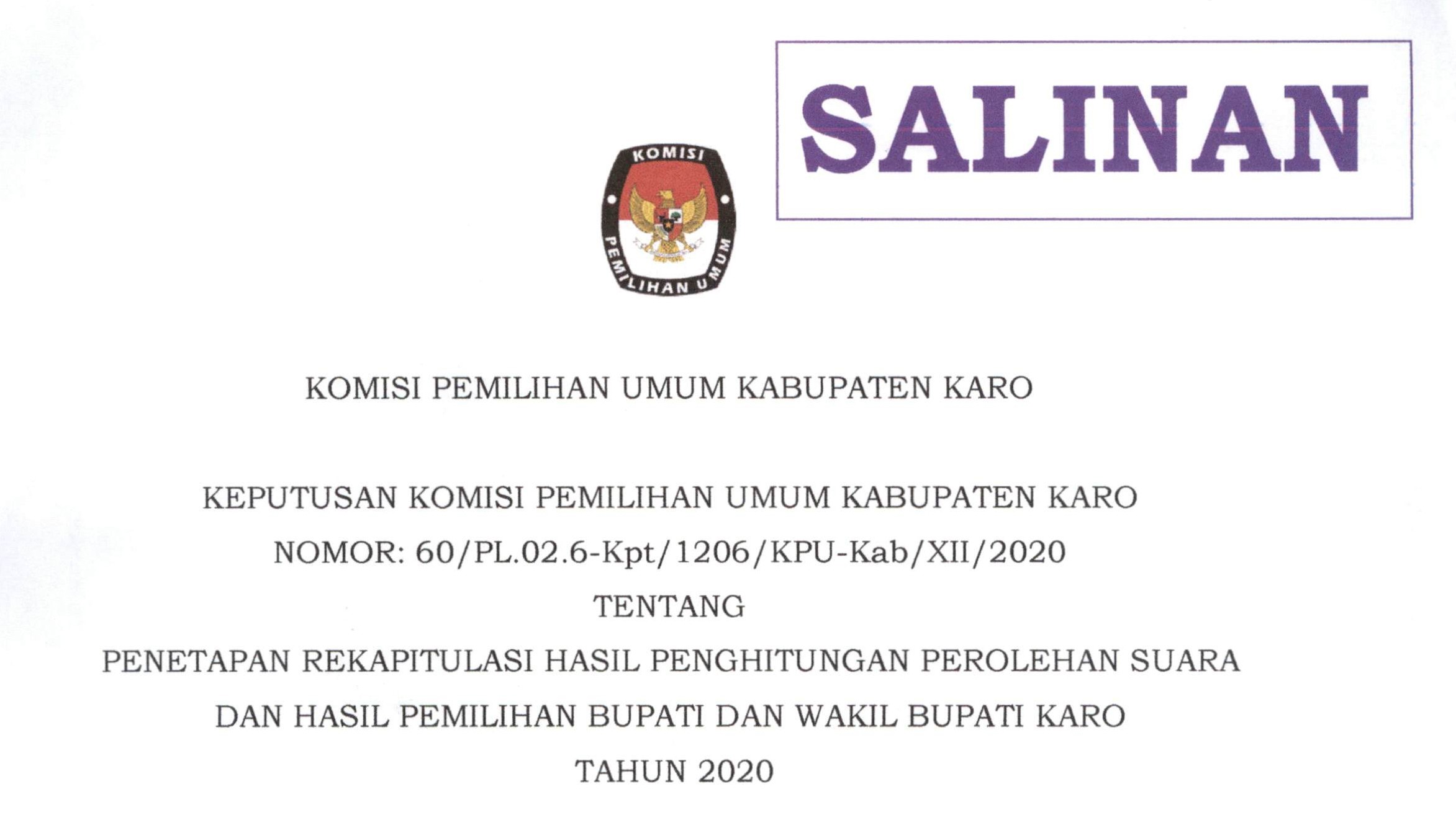 PENETAPAN PASANGAN CALON BUPATI DAN WAKIL BUPATI TERPILIH DALAM PEMILIHAN BUPATI DAN WAKIL BUPATI KARO TAHUN 2020