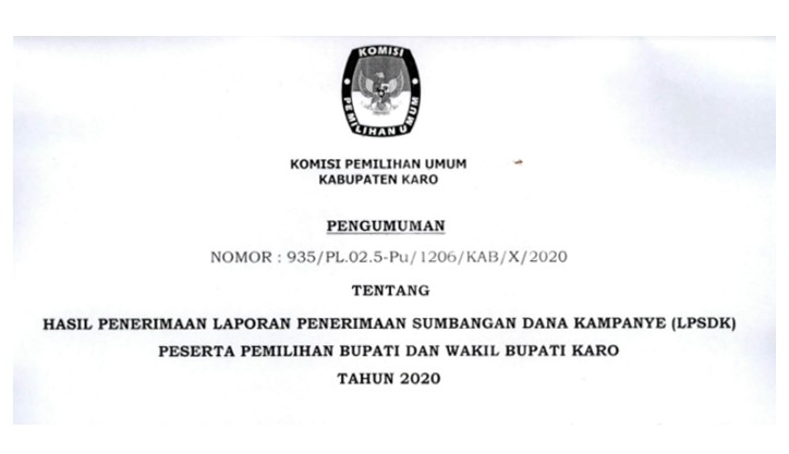 PENGUMUMAN TENTANG HASIL PENERIMAAN SUMBANGAN DANA KAMPANYE(LPSDK) PESERTA PEMILIHAN BUPATI DAN WAKIL BUPATI KARO TAHUN 2020