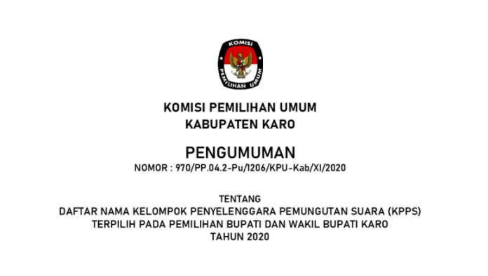 Berikut disampaikan Pengumuman Daftar Nama KPPS Terpilih Pada Pemilihan Bupati dan Wakil Bupati Karo Tahun 2020