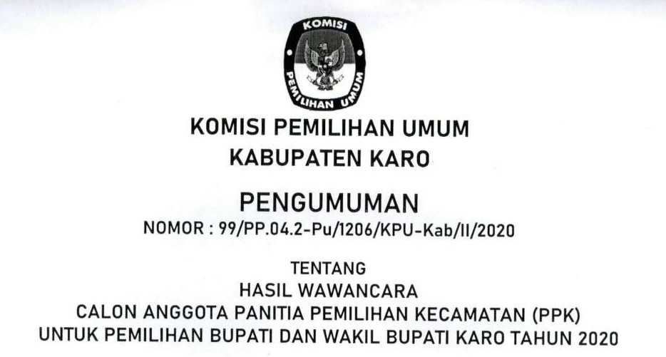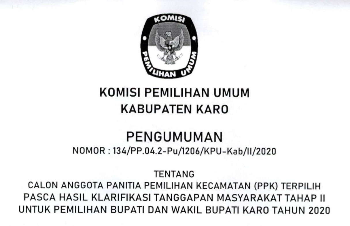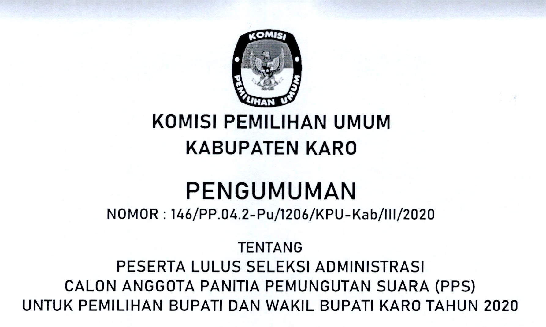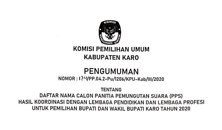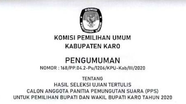Pengumuman Kelulusan Administrasi Calon PPS Se-Kabupaten Karo dan Sekaligus pengumuman jadwal ujian Tertulis calon anggota panitia pemungutan suara (PPS) untuk pemilihan Bupati dan Wakil Bupati Karo Tahun 2020.