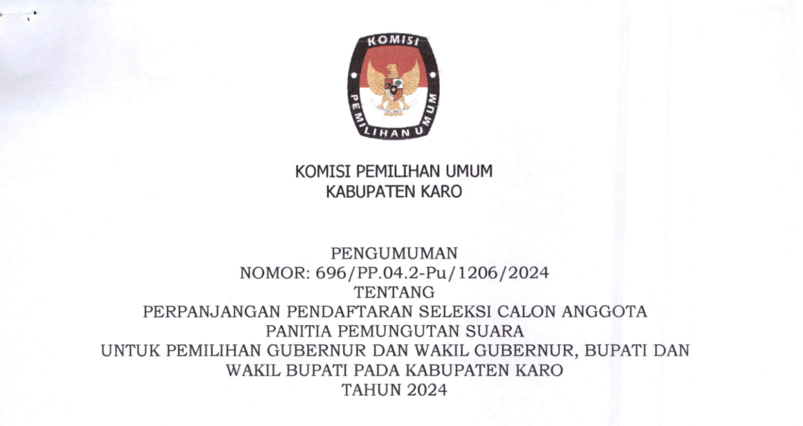 PENGUMUMAN PERPANJANGAN PENDAFTARAN SELEKSI CALON ANGGOTA PPS PEMILIHAN GUBERNUR DAN WAKIL GUBERNUR, BUPATI DAN WAKIL BUPATI 2024 Kamis, 09 Mei 2024 11:15 389 Pengumuman dapat dilihat DISINI Baca Selengkapnya