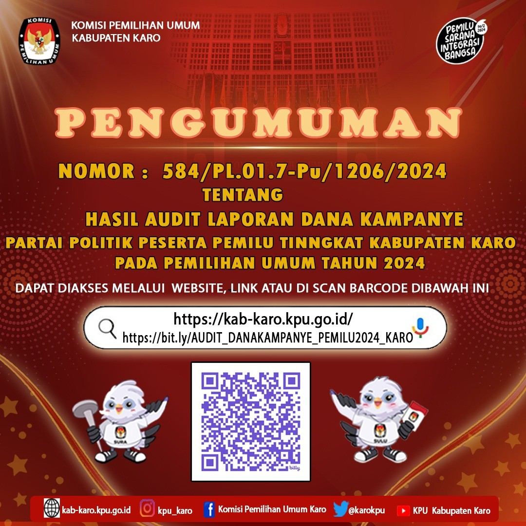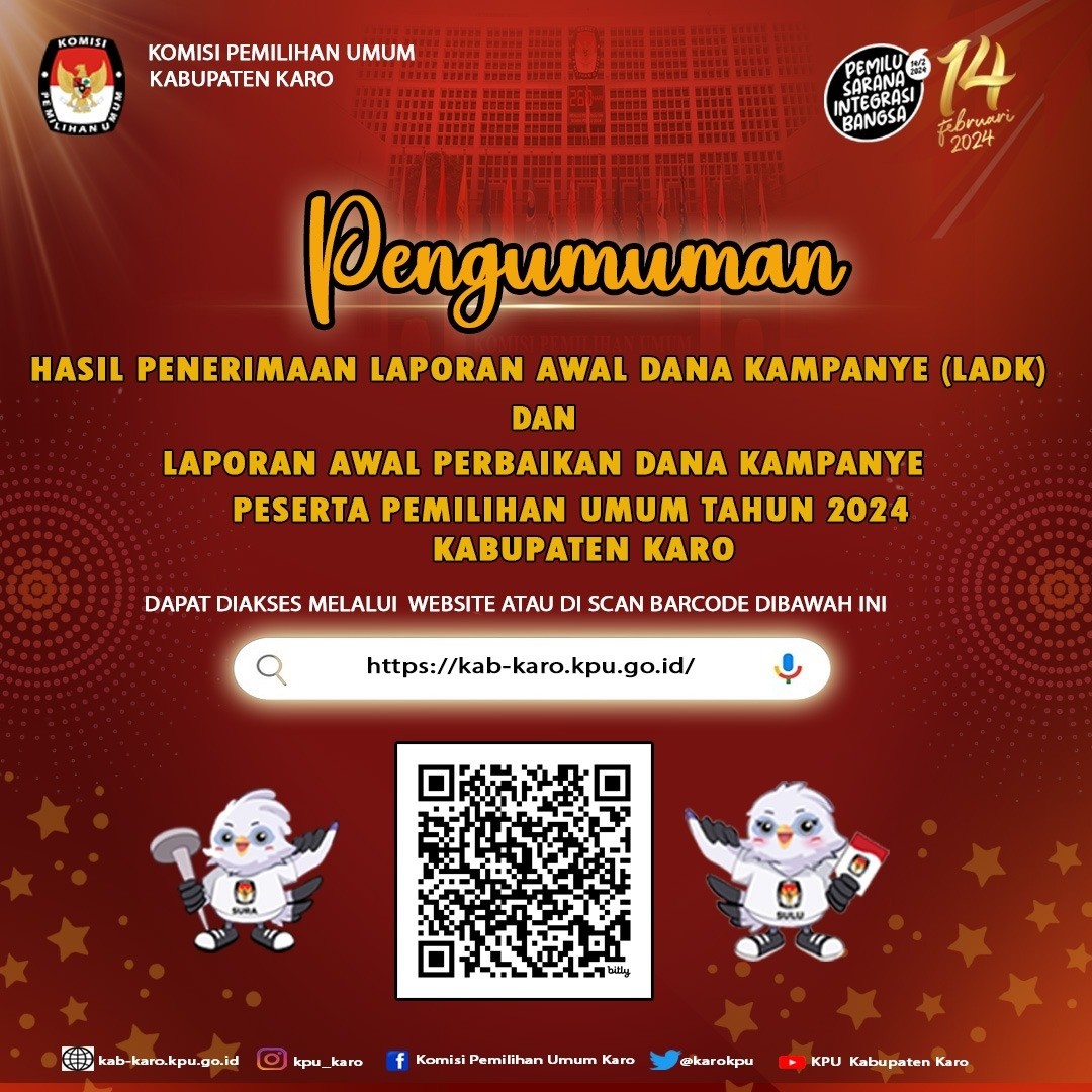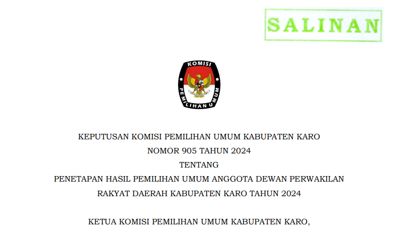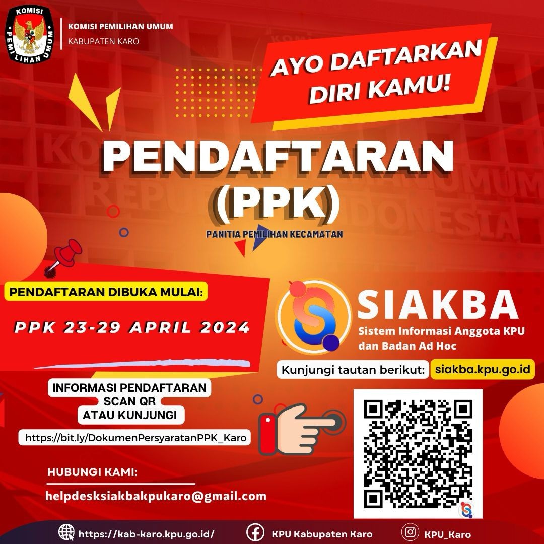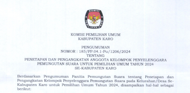 Komisi Pemilihan Umum Kabupaten Karo mengundang Warga Negara Indonesia yang memenuhi persyaratan untuk mendaftarkan diri sebagai Calon Anggota Panitia Pemilihan Kecamatan (PPK) untuk Pemilihan Gubernur dan Wakil Gubernur, Bupati dan Wakil Bupati Pada Kabupaten Karo Tahun 2024