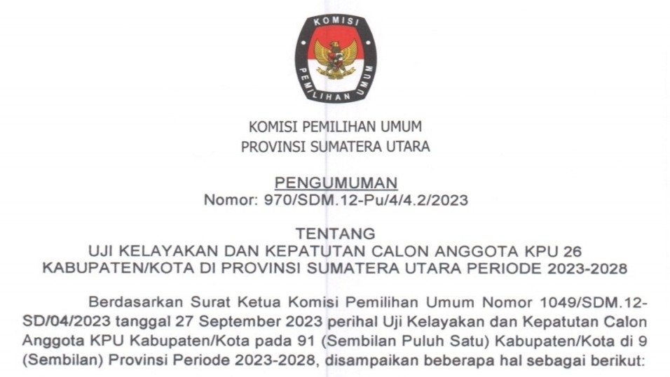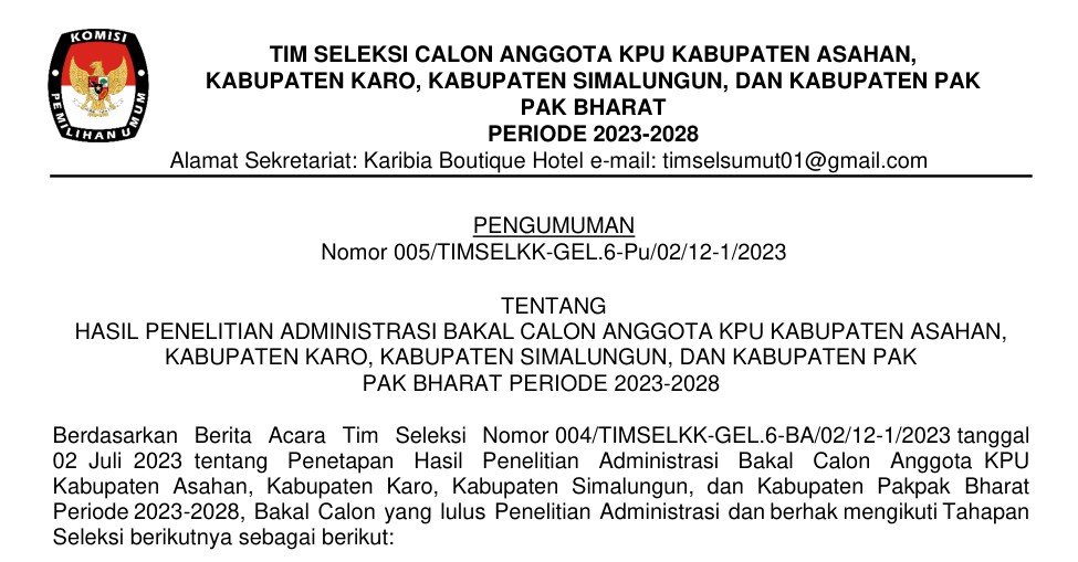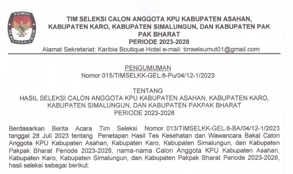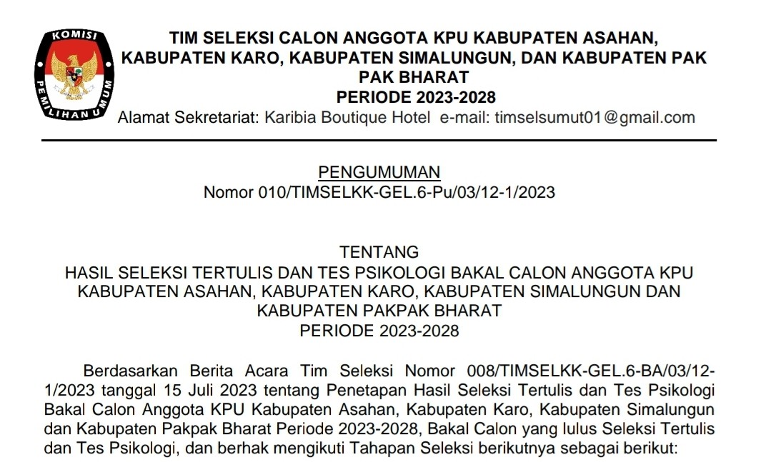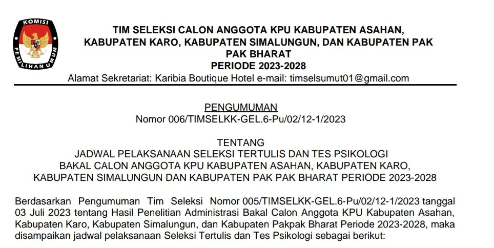 Tentang Jadwal Pelaksanaan Seleksi Tertulis Dan Tes Psikologi Bakal Calon Anggota KPU Kabupaten Asahan, Kabupaten Karo, Kabupaten Simalungun, dan Kabupaten Pakpak Bharat Periode 2023-2028